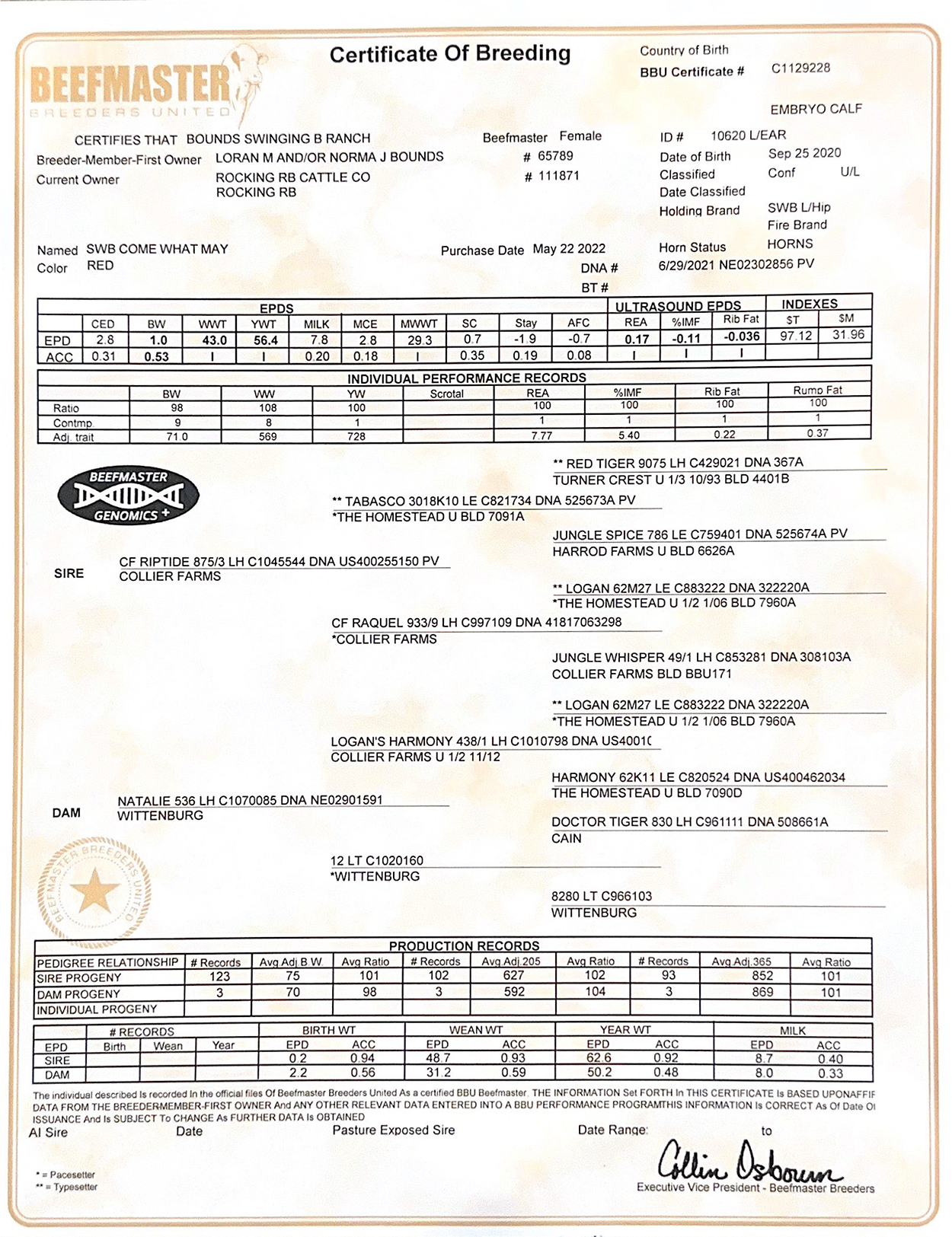 CF Riptide X Natalie here for a great combination. This female has a $M of 32.09 and ranks in the top 4% of the breed. Her $T is in the top 20%. WWT – top 10%, YWT – top 25%. What is more important, she has great potential of being a donor. Her phenotype is correct. Long, smooth and walks out perfect. She is parent verified and genotyped.